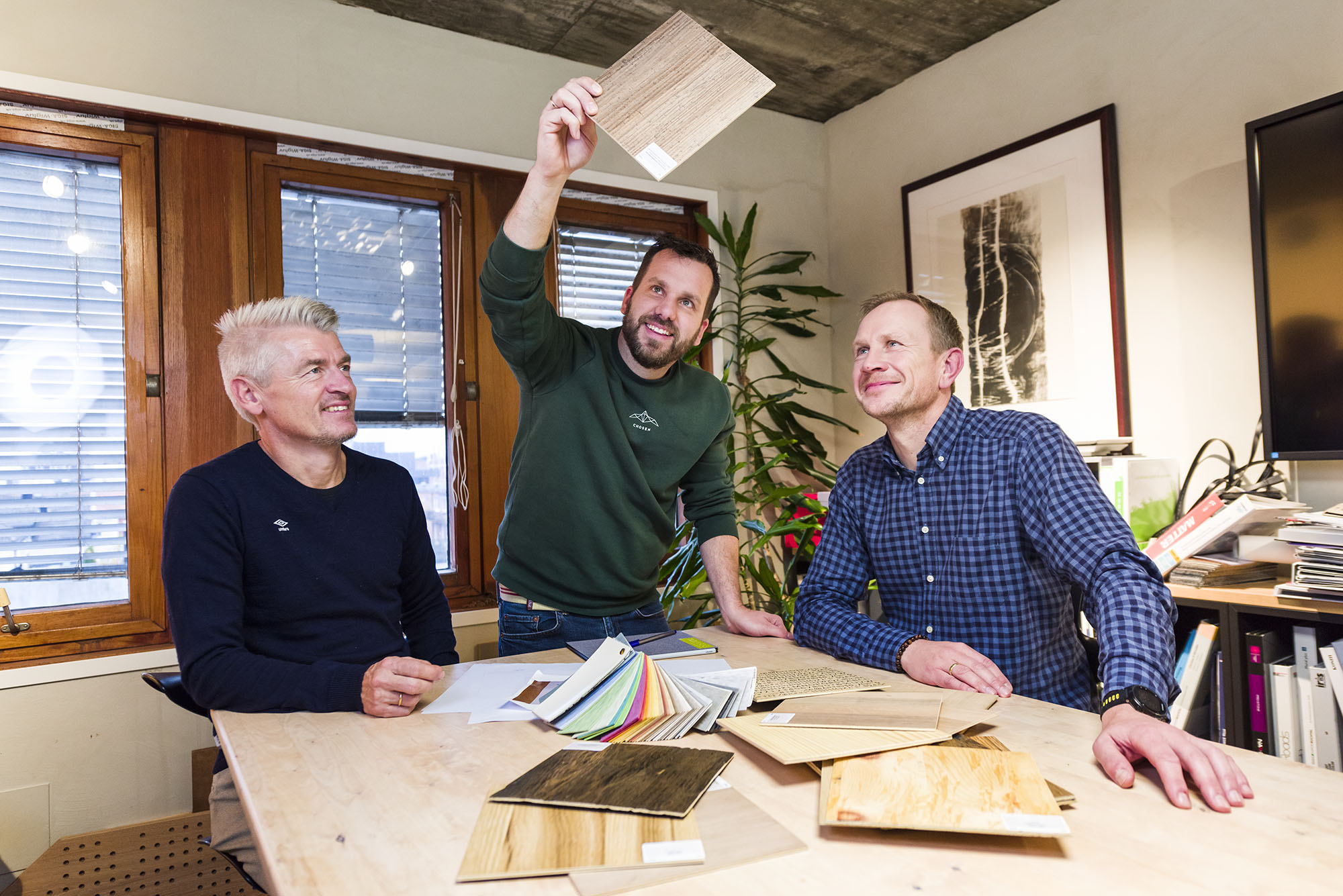 Tore Gustav Drivenes og Terje Mykland i God Driv dykker ned i bunker av tegninger og materialprøver sammen med arkitekt Michael Befus i Trollvegg Arkitektstudio. I flere år har de jobbet sammen for å meisle ut storstilte planer for Hunsøya Park, et tidligere industriområde midt i Vennesla.