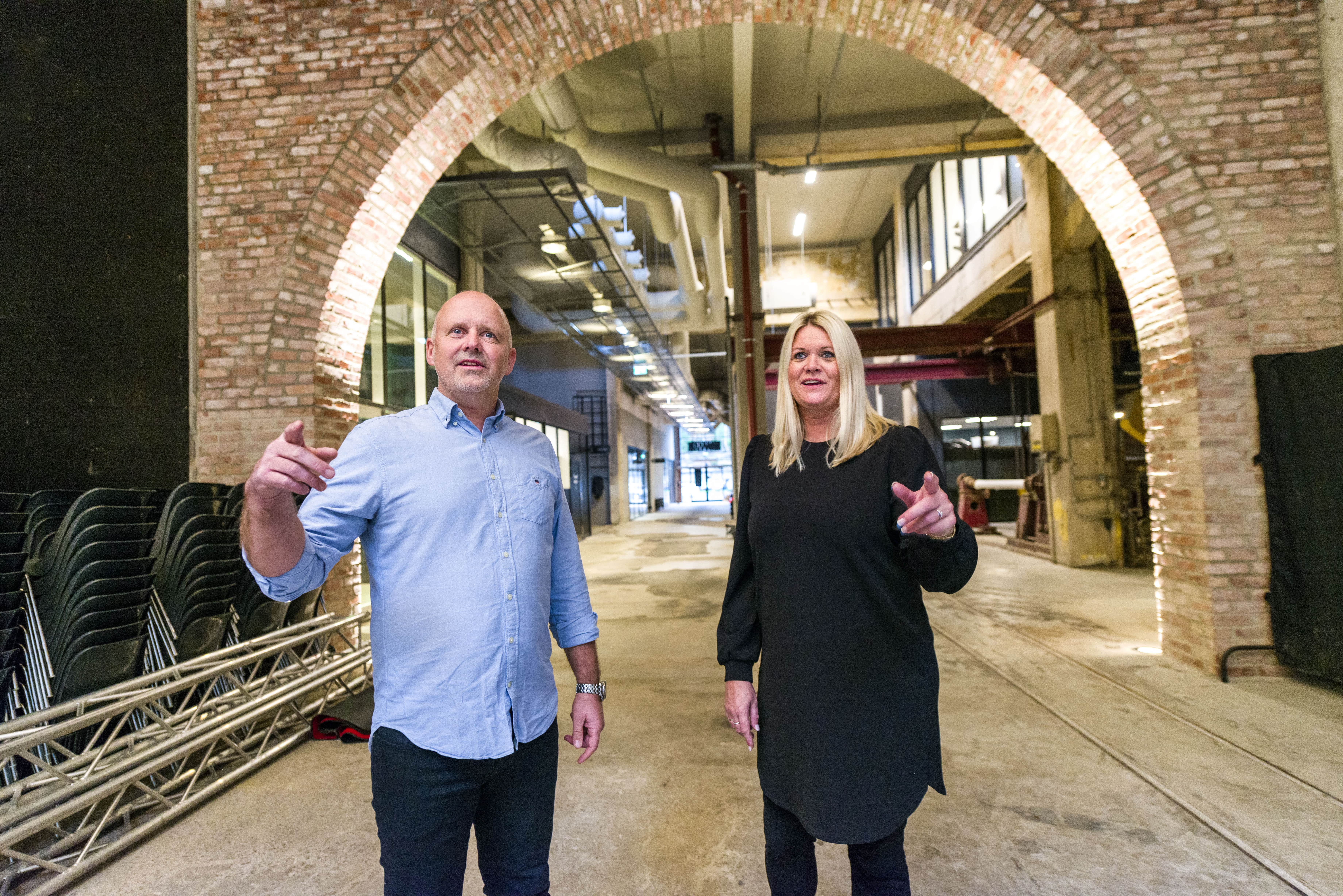 Trygve Aas i Hunsfos Næringspark og interiørarkitekt Vibeke Sagen Dale, sørger for at Hunsfos fabrikkers stolte historie blir sittende i veggene når gamle fabrikklokaler renoveres og blir som nye.